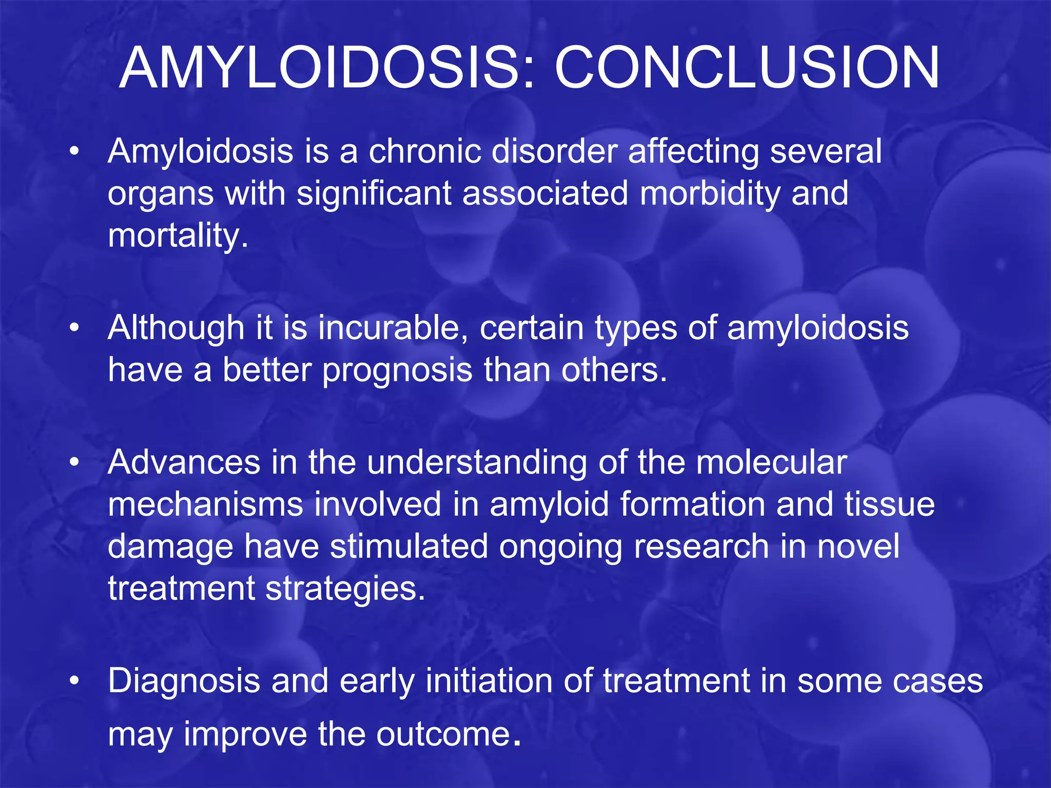 - The prognosis depends heavily on whether the disease is localized or systemic. Localized ocular amyloidosis often has a good visual prognosis, especially after surgical removal of the deposits. If it is part of systemic amyloidosis (like AL or ATTR), the overall prognosis depends on the severity of internal organ involvement.